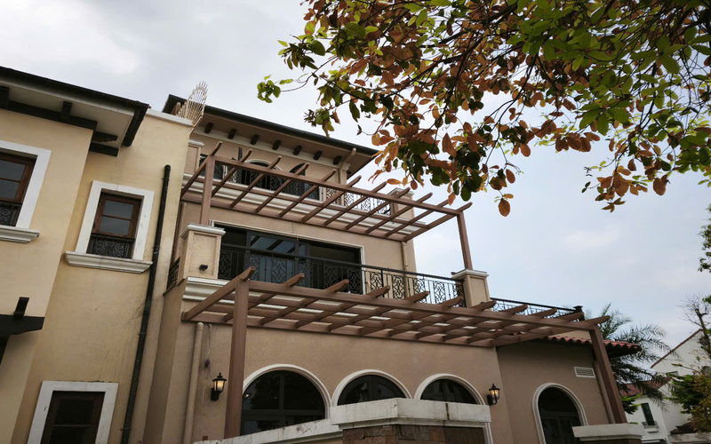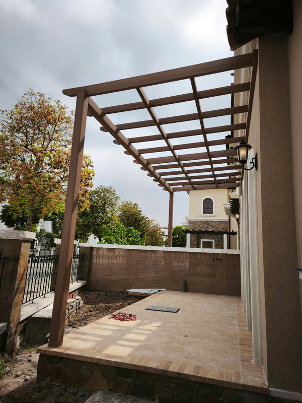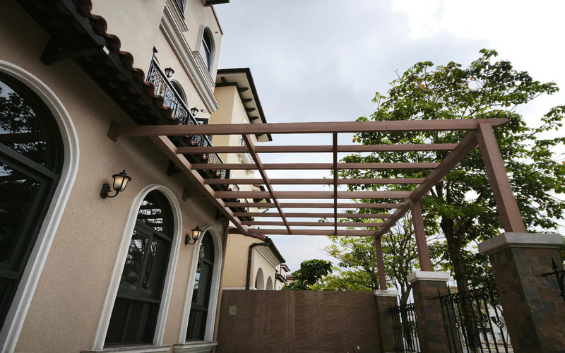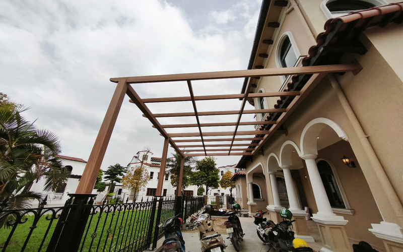 – Vật tư sử dụng: Cột hộp gỗ nhựa 150x150mm, thanh đà 50x150mm, hệ lam 40x90mm