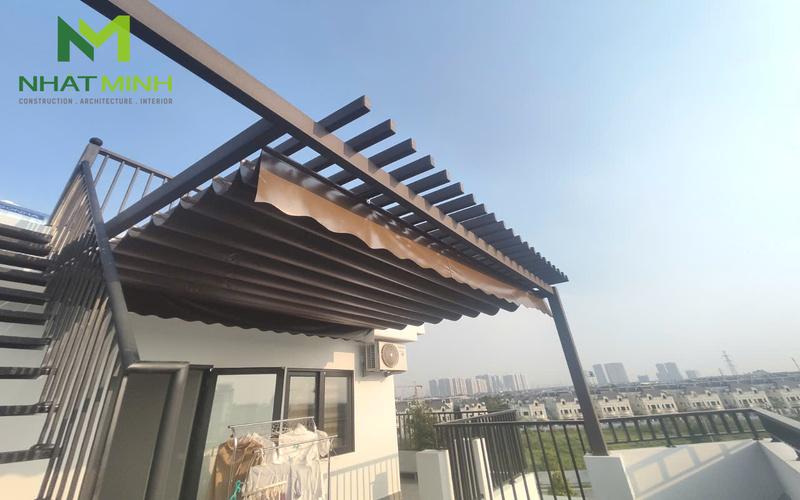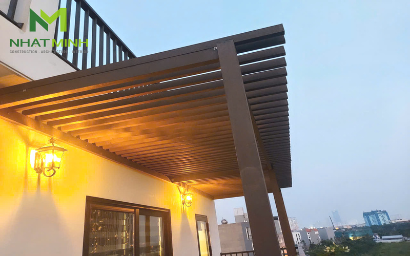 – Vật tư sử dụng: Cột hộp gỗ nhựa 120x120mm, thanh đà 60x120mm, hệ lam 40x80mm